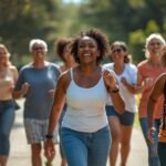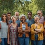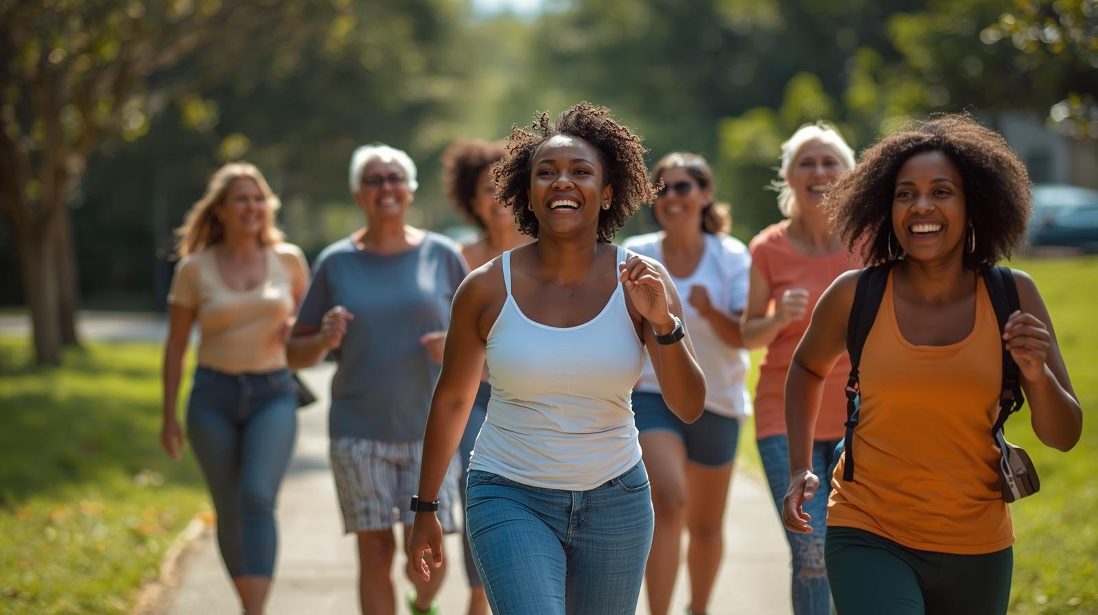 Um grupo de 4 amigos acima dos 40 anos (uma mulher parda, uma mulher negra, dois homens pardos) todos com roupas descontraídas aproveitando o dia em um parque ensolarado.